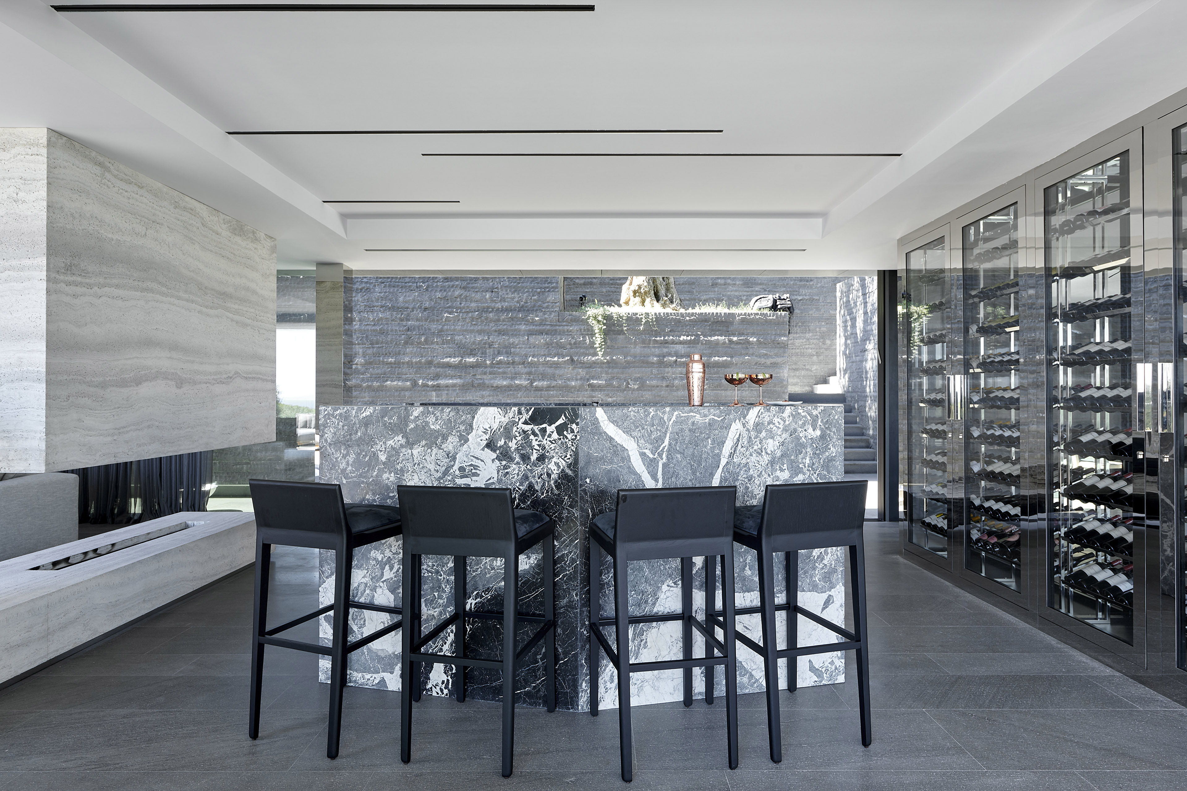Textured timber, precious marble, and volcanic basaltina define the material language, complemented by pieces from Minotti and Delcourt Collection and a curated selection of contemporary works from the owners’ private collection. The result is a residence of depth and character — cultivated, intimate, and unmistakably its own.