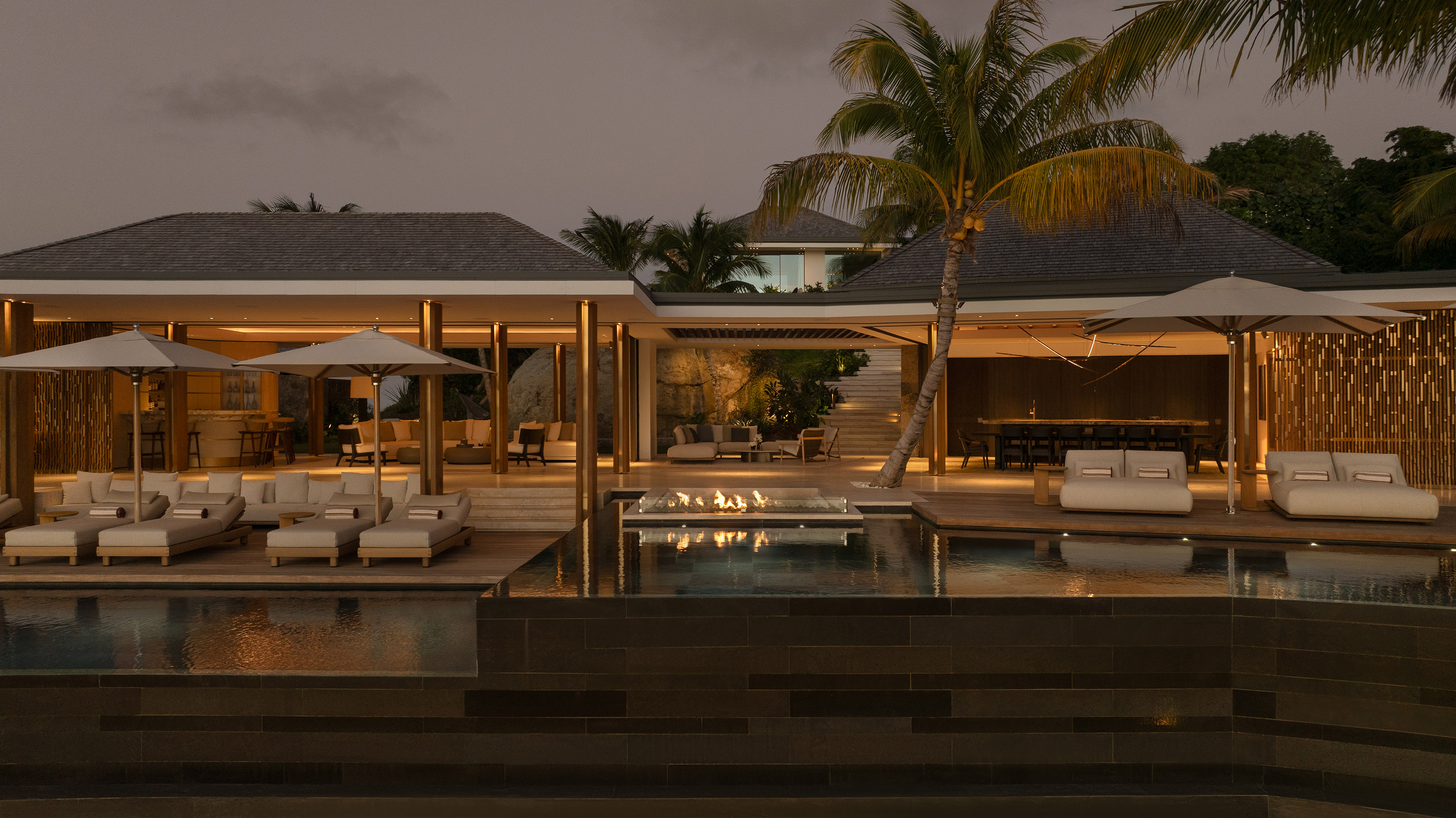 The villa’s culinary heart centres around a show kitchen, connecting elevated indoor dining spaces with a design-led outdoor pergola, allowing transitions from tailored gastronomic experiences to relaxed al fresco dining.