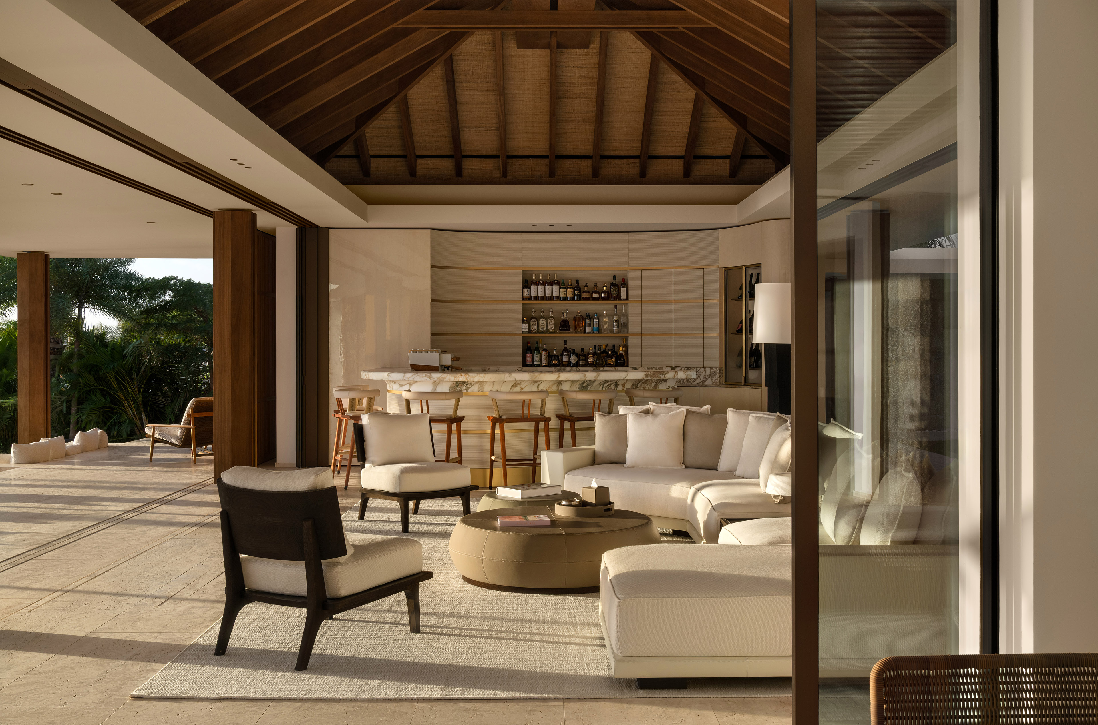 Luxury is in the details: deliberate, never excessive. At Omai Zilé, furniture by design luminaries like Christian Liaigre mingles with commissioned pieces and Minotti’s refined outdoor furnishings, while noble materials set the tone. Italian marble veined like a topographical map, timber mellowed by time, textiles that invite touch. The beauty is in how it all comes together.